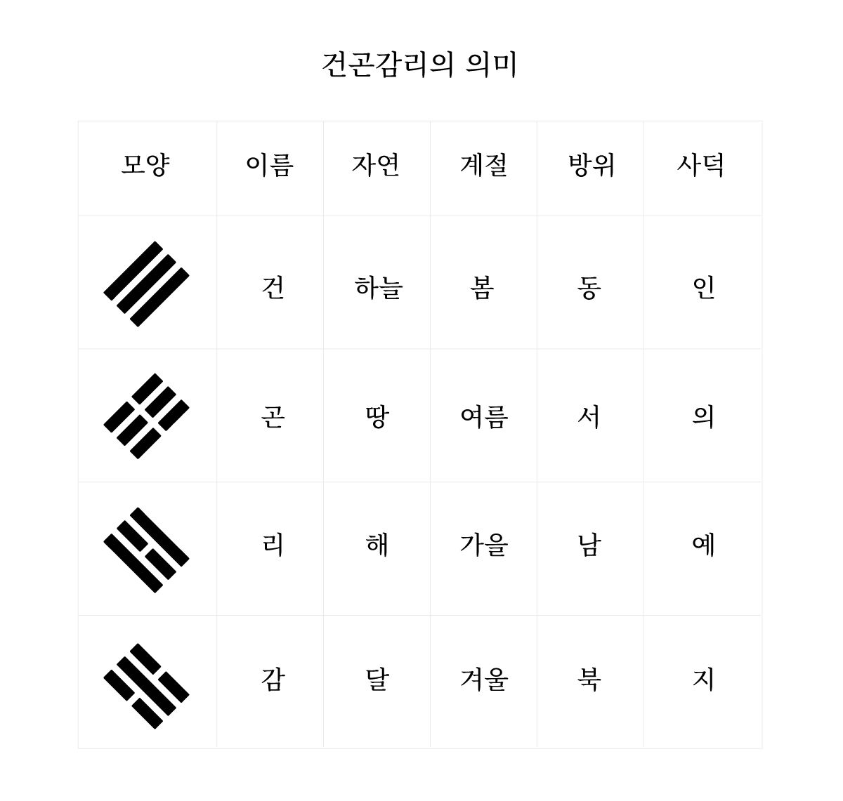우리나라 국기인 '태극기'(太極旗)는 흰색 바탕에 가운데 태극 문양과 네 모서리의 건곤감리(乾坤坎離) 4괘(四卦)로 구성되어 있다.